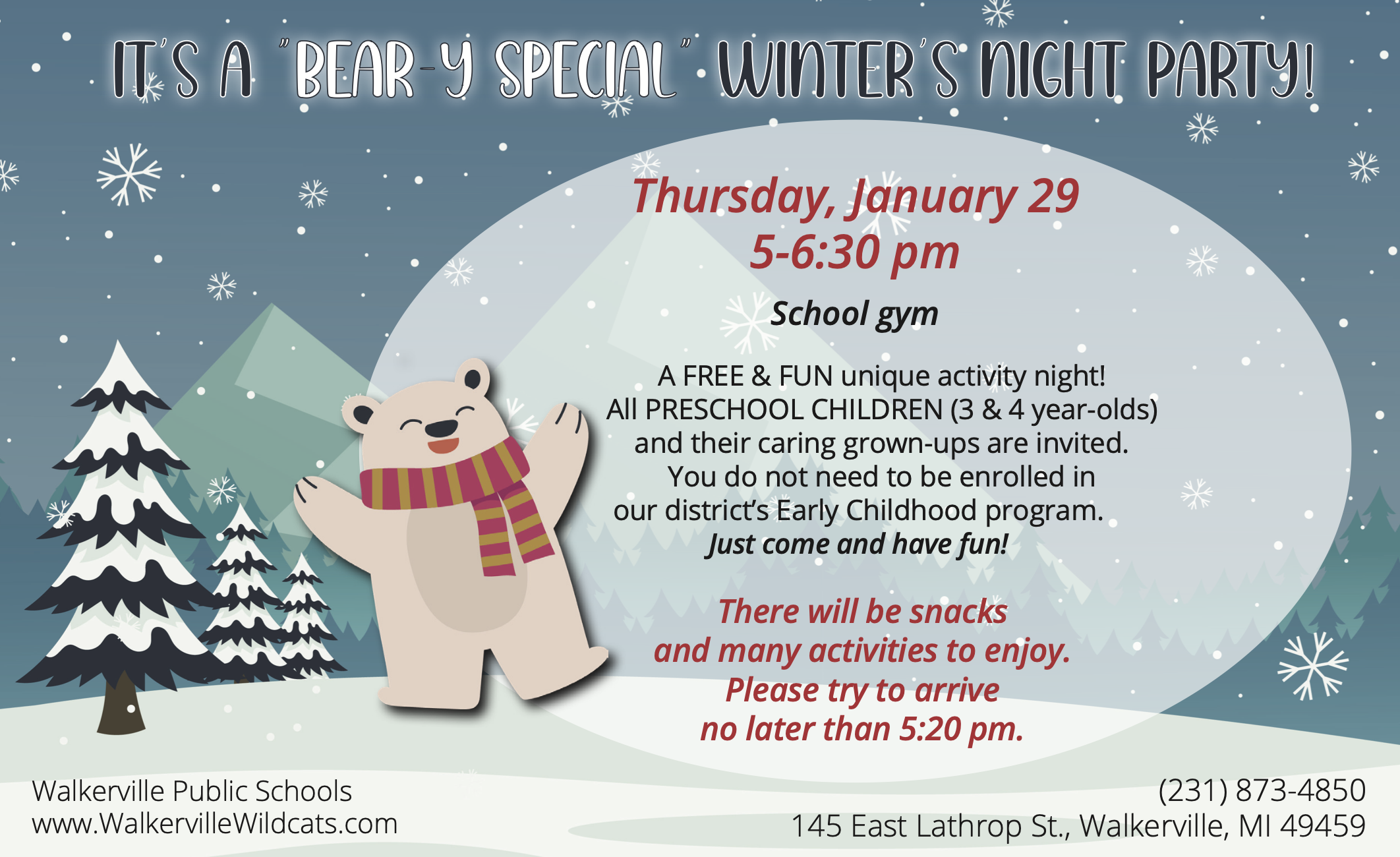 It's FREE, and you do not need to be currently enrolled in Walkerville Public Schools. Just come out and enjoy an early evening with other friendly little bears!