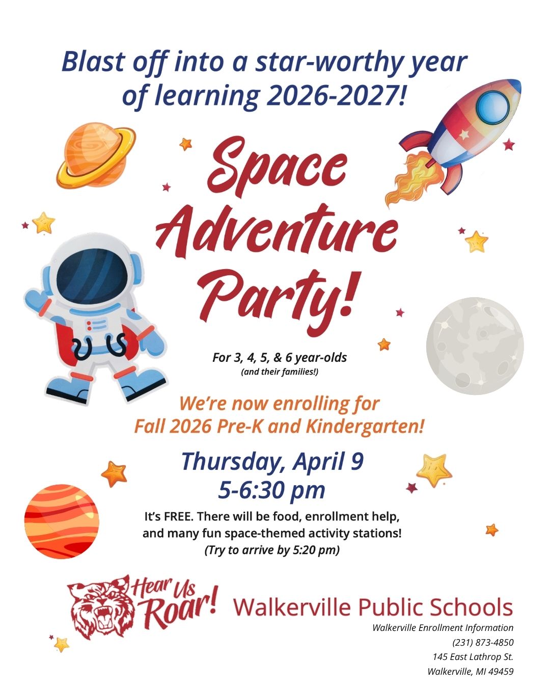 Walkerville Public Schools is inviting families to a fun, space-themed evening as we kick off enrollment for the 2026-2027 school year! Join us on Thursday, April 9 from 5:00 - 6:30 pm for a FREE event filled with food, hands-on activity stations, and support with enrollment.