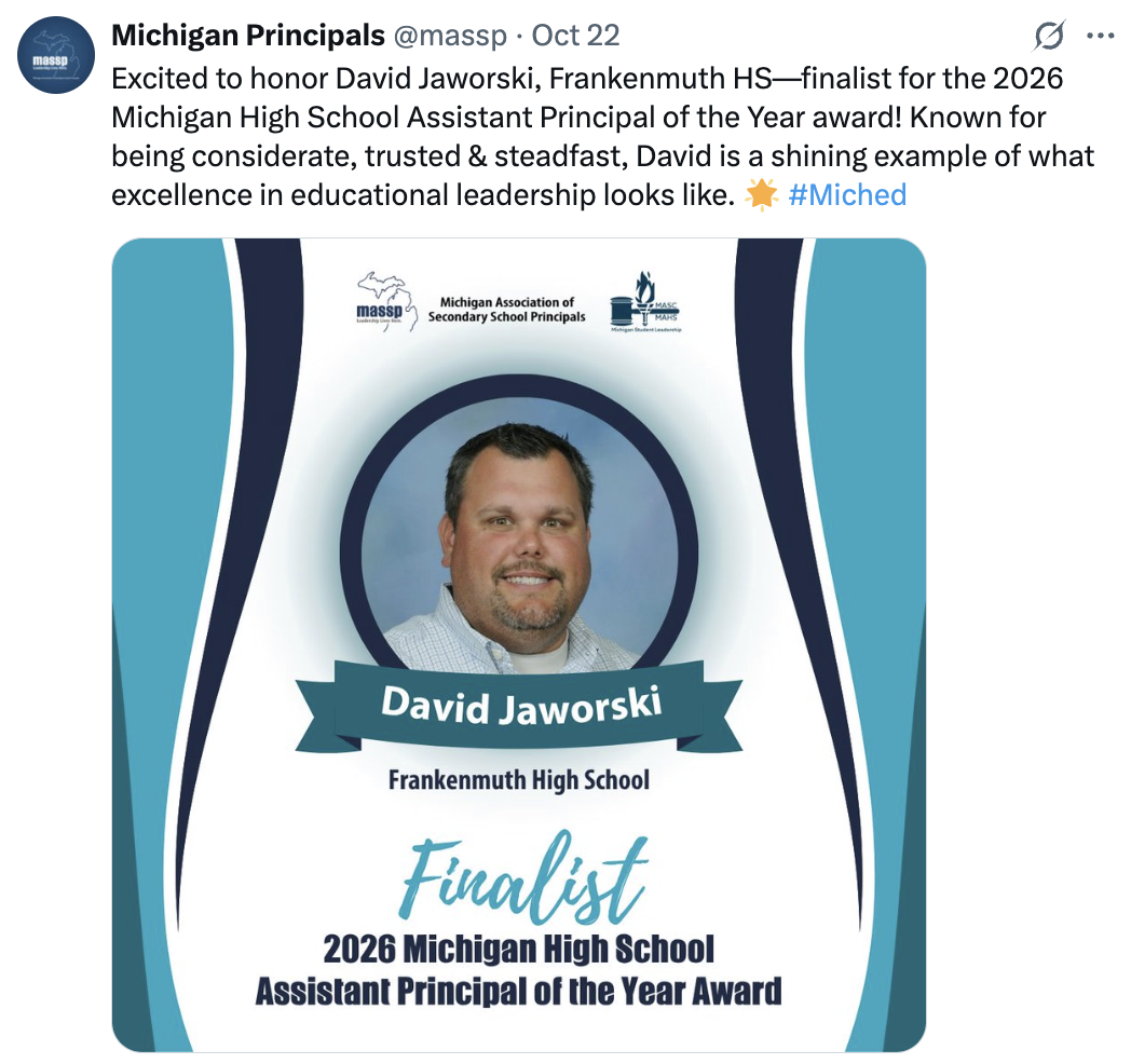 "The level of commitment our FSD staff has to the students and families in the Frankenmuth community is second to none," said Superintendent Grant Hegenauer. "I've seen how our staff always seeks ways to improve, to make great even greater."