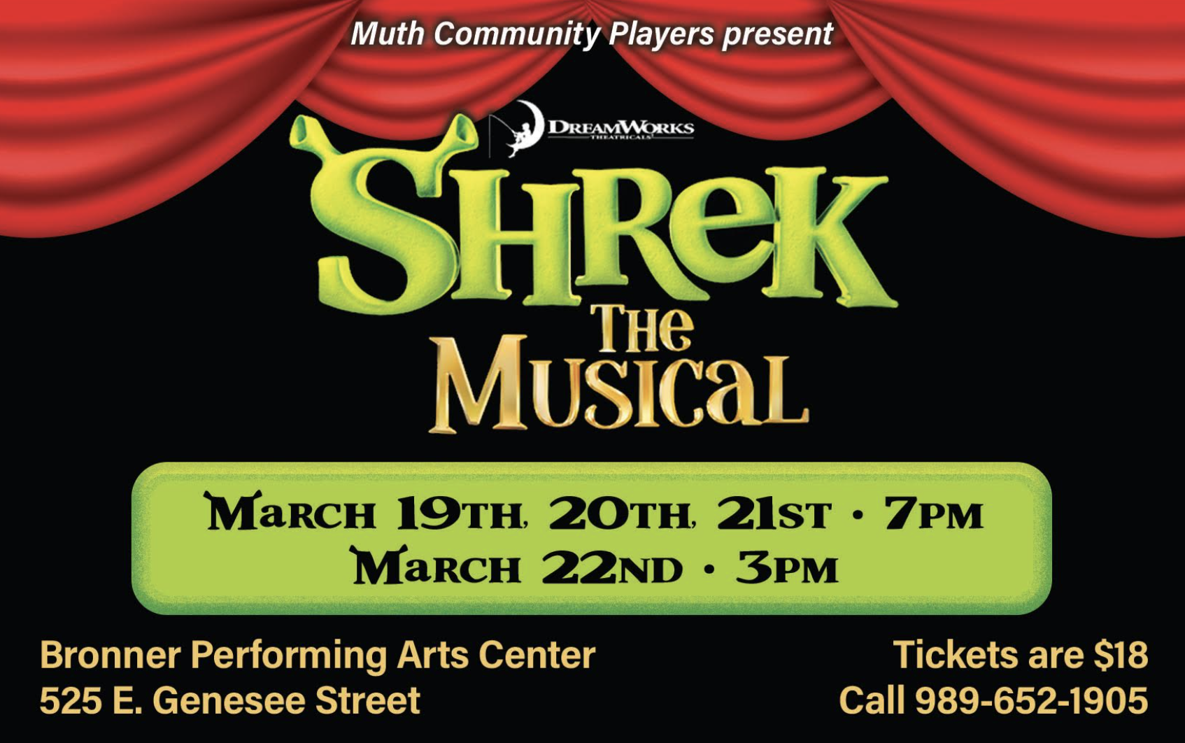 "Shrek the Musical" will be in the Bronner PAC in March.